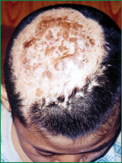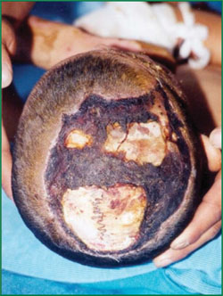 1、患兒9歲,15萬(wàn)伏高壓電頭皮電擊傷,深達(dá)顱骨。