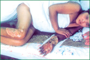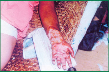2、 經(jīng)MEBT/MEBO治療55天,電擊傷的壞死組織逐步液化排除,腕前肌肉缺損處,逐步被新生肉芽組織填充,邊緣皮膚組織移行愈合。