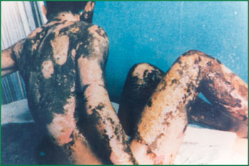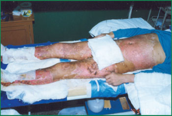 1、 患者,男,36歲,液態(tài)黃磷燒傷,面積80%(深Ⅱ度65%,Ⅲ度15%)