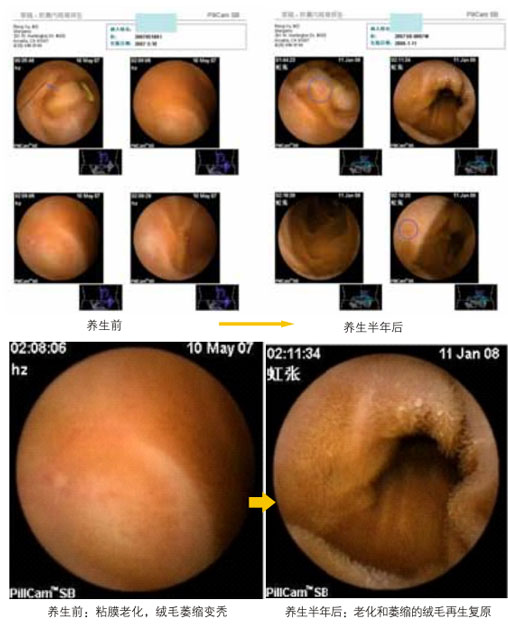 3. 衰老的胃腸粘膜再生復原:衰老的胃腸粘膜能復原回較年輕的粘膜,這在醫(yī)學和保健學上,從沒有人想到。而在本研究的再生復原療法上,已經(jīng)實現(xiàn)了。我們的研究表明,人過40歲,人的胃腸粘膜等開始走向衰老,其衰老程序的啟動比任何器官都早,過了50歲,人的胃腸粘膜就有約一半的細胞不發(fā)揮應(yīng)有的功能,并且衰老和凋亡了,到90歲,有功能的細胞也只剩下不到10%。我們的研究臨床應(yīng)用結(jié)果表明,只要進行半年的胃腸再生復原養(yǎng)生,衰老的胃腸粘膜就能原位再生復原,而后繼續(xù)保持再生復原養(yǎng)生,就能保障胃腸功能維持在正常較年輕的狀態(tài)。(圖14 為腸鏡圖片)