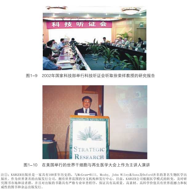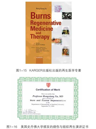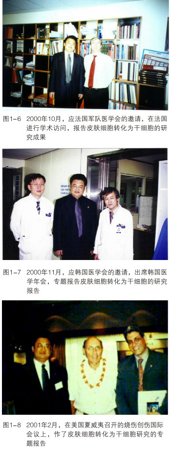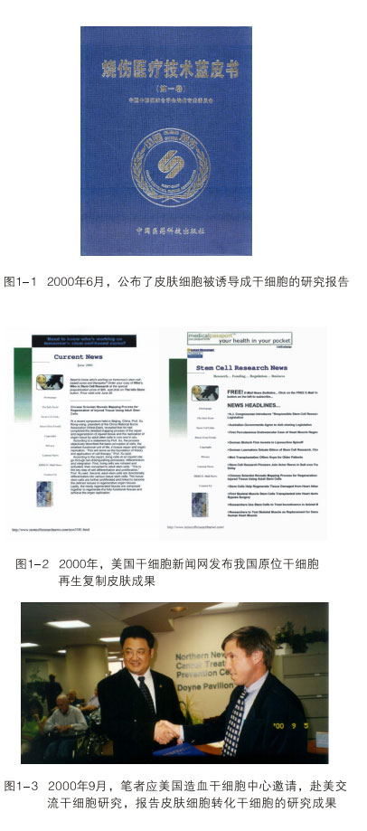 雖然我們在國際國內學術會議上反復地講解身體內由體細胞轉化為干細胞的實際規(guī)律,但世界胚胎干細胞研究的狂潮席卷生命科學界,各大學和醫(yī)院都設立胚胎干細胞研究室,都在按同一個夢想奮進。于是,我們又在2002年8月,搞了一個生命科學大爆炸新聞發(fā)布會,宣布已成功地實現(xiàn)了體細胞轉化為干細胞(潛能再生細胞)再克隆器官的全過程,公布了克隆出的組織器官實物,并宣稱5年后完成人類組織器官的全部復制。國家科技部也組織院士進行了科學聽證會議,隨即,美國舉行的世界干細胞與再生醫(yī)學大會和在新加坡舉行的干細胞大會特約我做嘉賓作如何用體細胞克隆組織器官、和臨床如何用于治療創(chuàng)傷和胃腸潰瘍疾病的專題演講。2004年,世界三大醫(yī)學文獻出版社之一的瑞士KARGER出版社①正式出版了我的再生醫(yī)學英文專著《燒傷再生醫(yī)學與療法》,封底書評介紹,這是一本用臨床應用實踐陳述普通細胞原位再生皮膚器官過程的書,對細胞生物學、干細胞研究、免疫學研究等,都有著極其重要的價值。出版社為了對大家的科學研究產(chǎn)生有利的作用,在出版社的網(wǎng)站上寫道:這是一本“革命性的和令人驚奇的”著作。這樣的呼吁,在世界范圍內產(chǎn)生了較大的影響,比如德國、英國、美國等國知名的生命科學家專程來華與我們交流干細胞的研究,瑞典科學委員會委托國家電視臺專程來華采訪。美國史丹佛大學特約去大學作專題學術報告,美國哈佛大學皮膚學教授們專程到家里進行學術交流。