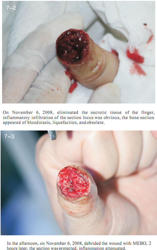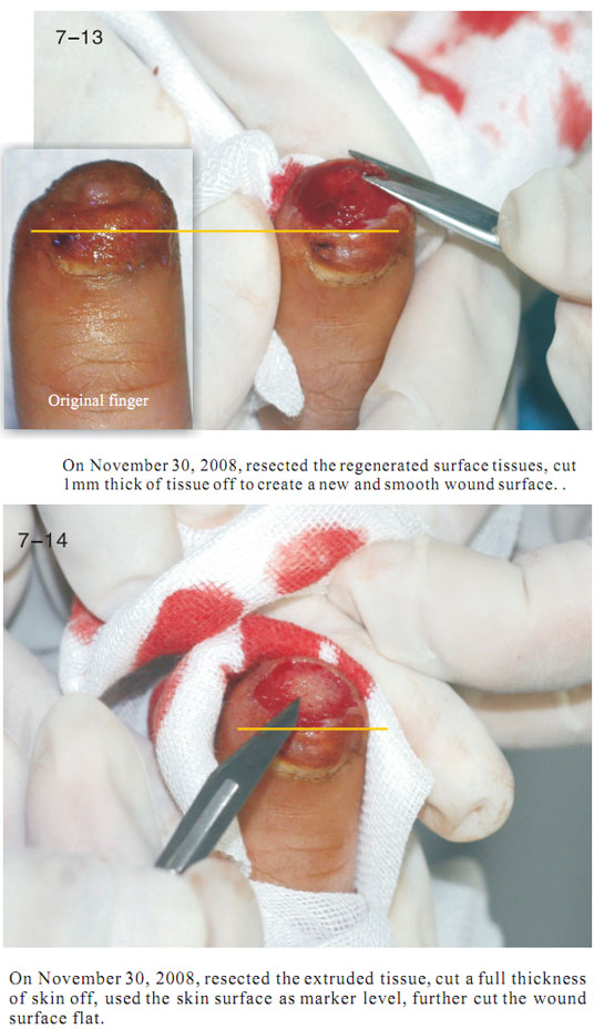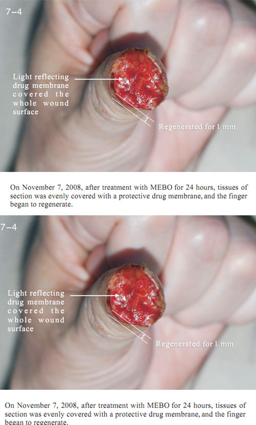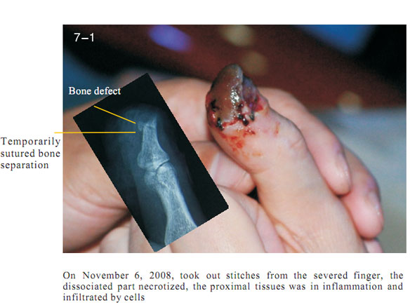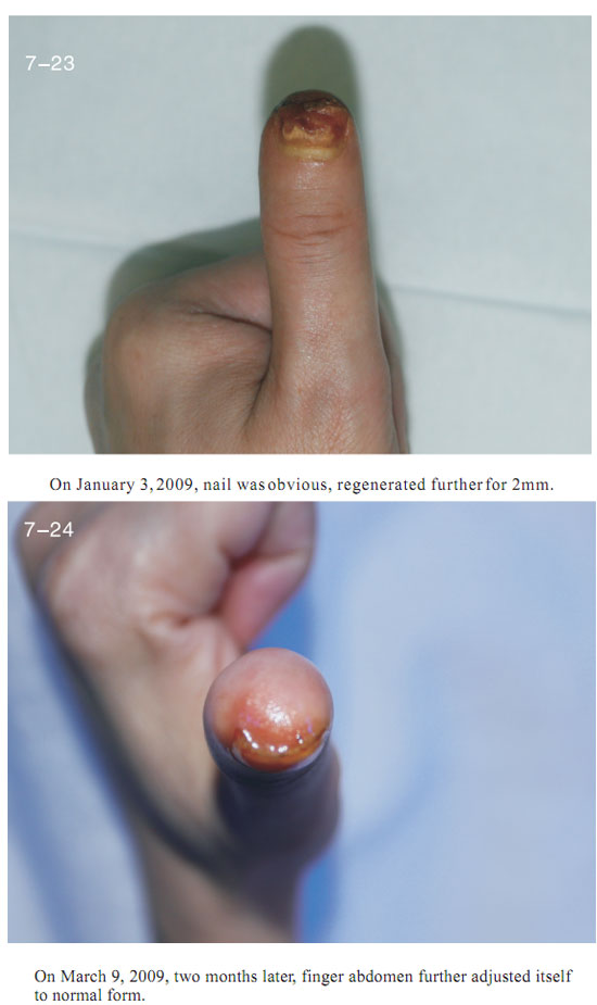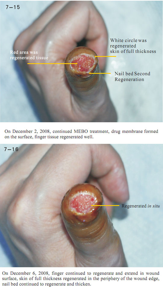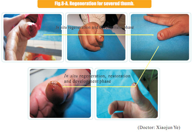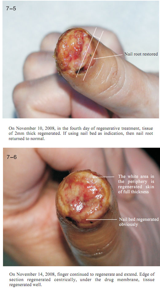 The data here showed the regeneration of severed last segment of finger, “severed” here means totally separated and completely defective, including bones, muscles, nerves, blood vessels, soft tissues, and all tissues composing skin.  Generally, replantation is currently used in surgical therapy for treating the severed fingers.  While, for the last segment, because of its very small blood vessels and the tiny location of a finger end, it is really difficult for the tissues to survive after the surgery; the alternative method is only to be a destructive method of wound section closure, this resulting in a life long deformity of the finger.