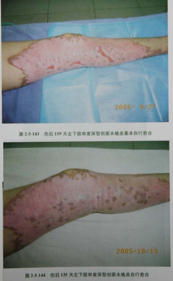 2)此類創(chuàng)面多發(fā)生在頭頂、手、足及小腿部位,創(chuàng)面很深達(dá)骨膜。