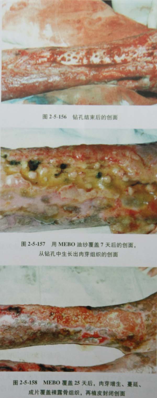 2已出現(xiàn)骨組織暴露,則采用暴露骨骼的清創(chuàng)鉆孔,然后以MEBO營(yíng)養(yǎng)保護(hù)創(chuàng)面,一般在715天即可見暴露骨骼的鉆孔部位長(zhǎng)出肉芽組織,此種肉芽組織在MEBO的作用下逐漸擴(kuò)展以至覆蓋暴露的骨骼,繼續(xù)以MEBO換藥促進(jìn)創(chuàng)面產(chǎn)生K1919型角蛋白),培養(yǎng)皮膚組織愈合創(chuàng)面。