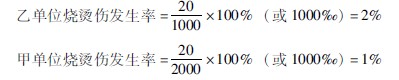 示例331甲單位共有職工2 000人,年內(nèi)發(fā)生燒燙傷者20例,乙單位共有職工1 000人,年內(nèi)發(fā)生燒燙傷者也為20例,試問(wèn)他們的燒燙傷發(fā)生率分別為多少?