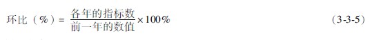 第(2)欄:環(huán)比☆,以前一時(shí)點(diǎn)或時(shí)期(年)的指標(biāo)(病床數(shù))為基數(shù)(分母),因基數(shù)依次更換,用公式335算得各個(gè)時(shí)點(diǎn)或時(shí)期的相對(duì)比(環(huán)比)。