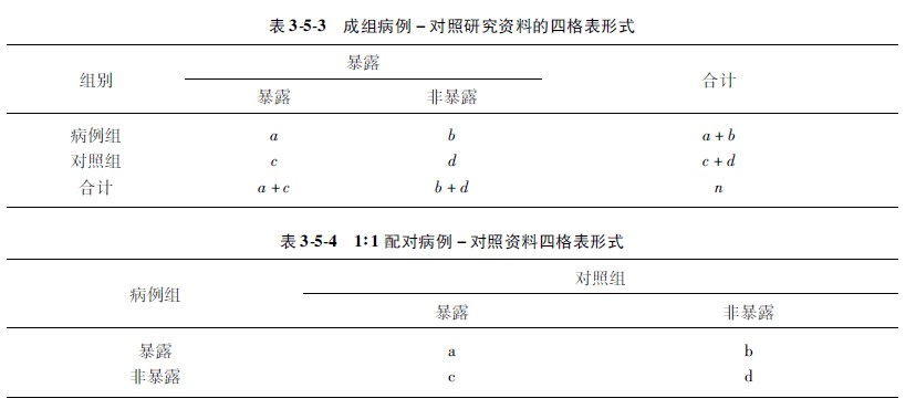 “病例-對照研究”是通過回顧方法比較病例和對照患者在患病前暴露于某種可能的危險(xiǎn)因素方面的差異,分析該因素與疾病的可能關(guān)系。病例-對照研究中,如果病例組與對照組的暴露史只取暴露和非暴露兩個(gè)水平,常用設(shè)計(jì)方法有兩種,一個(gè)是成組的病例對照設(shè)計(jì),另一個(gè)是配對的病例-對照設(shè)計(jì),即1∶1配對設(shè)計(jì)。它們雖然都是采用四格表排列形式,但內(nèi)容布局不一樣(見表353和354)。
