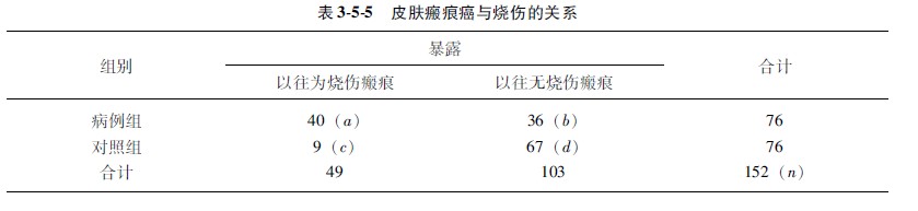 2比數(shù)比的假設(shè)檢驗(yàn):當(dāng)OR=1時(shí),認(rèn)為瘢痕癌與燒傷瘢痕無關(guān)聯(lián)。