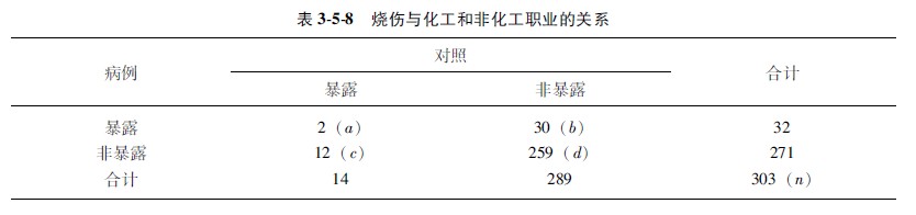 示例353某醫(yī)生研究皮膚瘢痕癌與燒傷瘢痕的關(guān)系,資料匯于表355中。問燒傷瘢痕是否是構(gòu)成燒傷瘢痕癌的危險(xiǎn)因素?