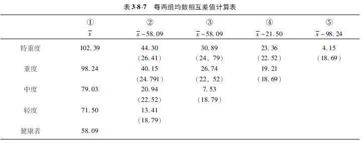將所計算的兩均數(shù)相差界限顯著界值(Q×sx)填入表388中的②、③、④、⑤欄相應(yīng)數(shù)字的下方。