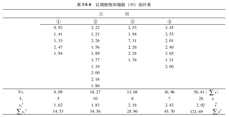 示例382測得輕度、中度、重度、特重度燒傷病人的紅細(xì)胞飽和指數(shù)(SI,正常值為09~11)記錄于下(表388),問四種程度的燒傷病人紅細(xì)胞飽和指數(shù)(SI)有無顯著差異?
