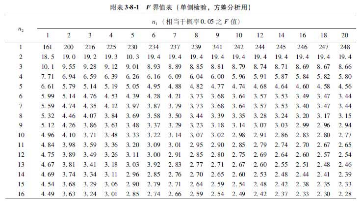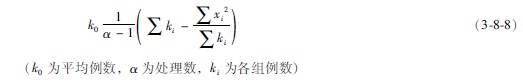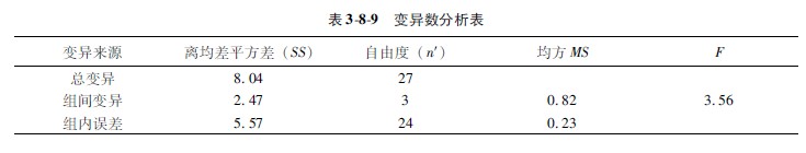 各組個(gè)體數(shù)目不同時(shí)的F檢驗(yàn)方法與個(gè)體相同者基本相似,只是在計(jì)算組間離均差平方和時(shí)應(yīng)當(dāng)注意各組的分母不盡相同。以例382說明: