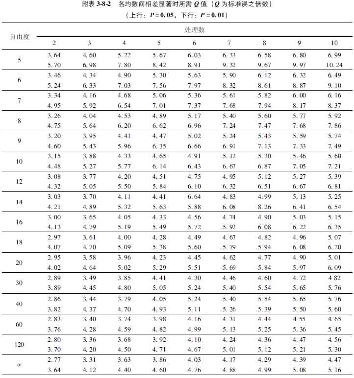 4確定各組均數(shù)相差顯著時(shí)所需Q值:結(jié)果見表3811。