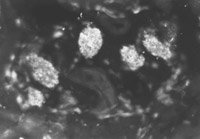 用特異的小鼠抗人角蛋白19型的單克隆抗體(McAb)對正常和燒傷皮膚免疫細(xì)胞化學(xué)觀察結(jié)果表明,兩例正常皮膚表皮再生干細(xì)胞數(shù)量較少,可見少量顯示熒光的表皮細(xì)胞再生干細(xì)胞(圖5-4-1),即角蛋白19型陽性細(xì)胞。燒傷后24h,熒光顯微鏡下,顯示熒光的表皮再生干細(xì)胞數(shù)量中等程度(圖5-4-2),燒傷后4天,在汗腺、毛細(xì)血管和毛囊周圍可見開始增多的潛在表皮干細(xì)胞(圖5-4-3)。
