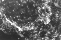 2. 生物素—抗生物素蛋白DCS體系間接免疫熒光染色 先將冰凍切片用10%的馬血清于4℃孵育20min,然后滴加1:20稀釋的小鼠抗人角蛋白19型單克隆抗體(第1抗體)4℃孵育過夜。切片在磷酸緩沖液中涮洗后加第2抗體,即7.5礸/ml生物素化的馬抗小鼠IgG抗體(Vector Laboratories Burlingame, CA, USA),4℃孵育1h。涮洗后,加10礸/ml熒光素-抗生物素蛋白DCS(Vector Laboratories Burlingame, CA, USA)于4℃孵育1h。將切片涮洗干凈后,用含10%PBS和1%對苯基二胺(P-phenylenediamine)的甘油做介質(zhì)封片。對照染色切片,則不加第1抗體。標(biāo)本在Olympus反射式熒光顯微鏡下觀察,并用ASA400 KODAK膠卷照相。