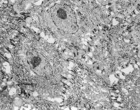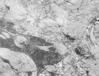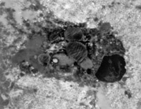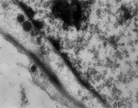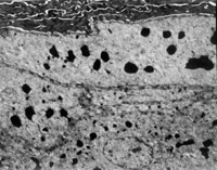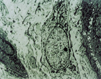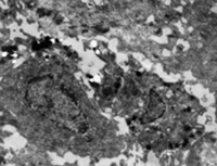 經MEBT/MEBO治療10天,創(chuàng)面組織切片可見表皮棘層棘細胞出現并有橋粒連接(圖5-3-14~5-3-15)。顆粒層顆粒細胞出現。在基底細胞層可見黑色素小體(圖5-3-6~5-3-17)。并可見小血管周圍的吞噬細胞有吞噬現象(圖5-3-18),說明其功能也已經在恢復。
