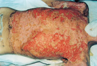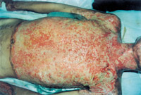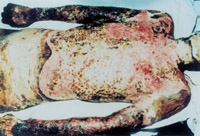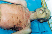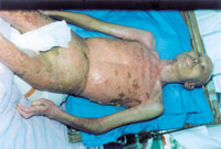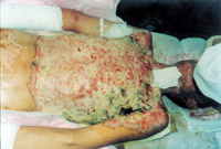入院后即快速補(bǔ)液糾正休克,行氣管切開,改善通氣功能,左前臂、雙小腿Ⅲ度環(huán)形焦痂切開減張,改善肢端血運(yùn)。上腔靜脈穿刺置右心漂浮導(dǎo)管行心功能各項(xiàng)指標(biāo)監(jiān)測(cè)。于傷后第二天行四肢切痂微粒植皮,傷后第六天行胸腹部切痂植大張開洞異體表,傷后10天(術(shù)后4天)胸腹部嵌植小片自體皮?;颊邆?8天出現(xiàn)嚴(yán)重綠膿桿菌敗血癥,持續(xù)低溫昏迷一周,經(jīng)全力搶救,敗血癥得以控制;又先后9次行植皮手術(shù),大部創(chuàng)面封閉;曾于傷后43天出現(xiàn)左眼角膜潰瘍,以點(diǎn)眼、球后結(jié)膜下注射等治療,潰瘍愈合。住院期間為預(yù)防應(yīng)激潰瘍,控制感染,防止肺部并發(fā)癥等,亦采取了相應(yīng)的措施。共住院70天。