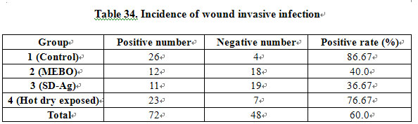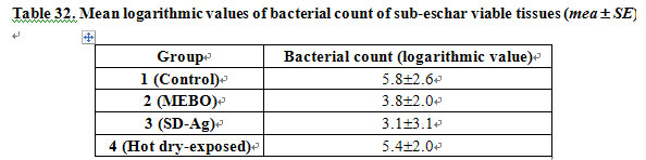 1) Bacterial Count of Sub-Eeschar Viable Tissues: Table 32 shows the mean logarithmic values of bacterial count of sub-eschar viable tissues in each group. The results indicated the mean values in groups 2 and 3 were significantly lower than those in groups 1 and 4 (P<0.01). No marked difference of this value was noted between groups 2 and 3 (P>0.05) or between groups 1 and 4 (P>0.05).