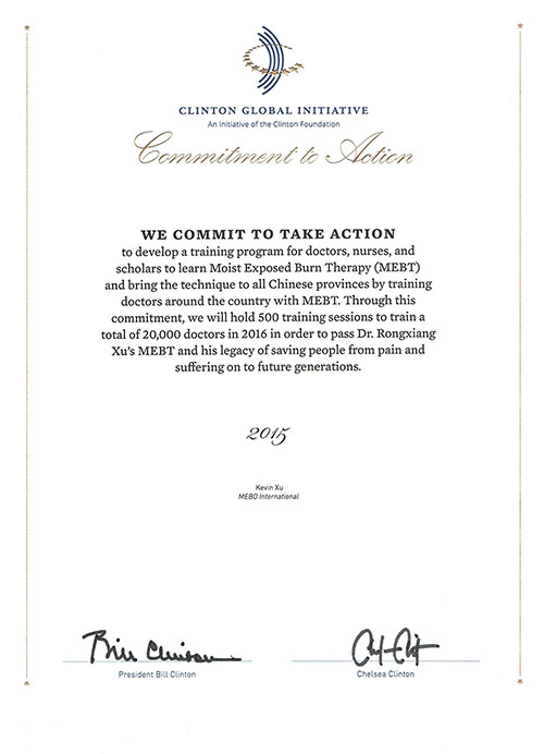 “我們承諾實施燒傷濕潤暴露療法培訓項目,將該技術(shù)推廣到全國各個省份,為醫(yī)生、護士以及學者提供濕潤暴露療法的培訓。我們承諾,在2016年將會開辦500個培訓班,培訓2萬名醫(yī)生,將徐榮祥大夫的濕潤暴露療法以及其救死扶傷的精神傳承。”