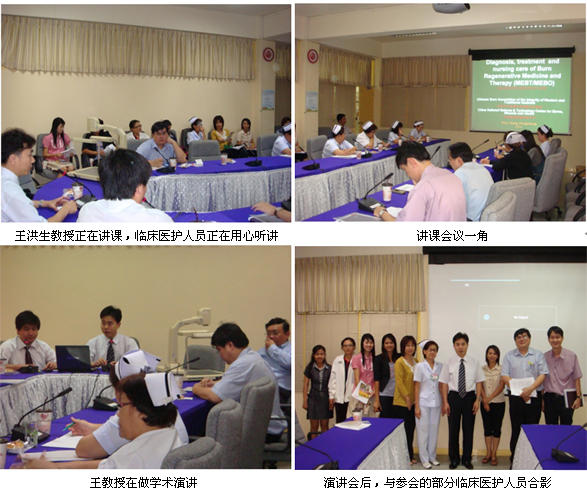 泰國2011年醫(yī)療開發(fā)活動(dòng)繼續(xù)進(jìn)行。2011年3月7日,受Kampangpet Provincial Hospital, (Kampangpet, Thailand)醫(yī)院外科邀請,北京美寶燒傷創(chuàng)瘍研究所副所長、中國燒傷創(chuàng)瘍科技中心臨床研究部王洪生主任于13點(diǎn)30抵達(dá)該醫(yī)院會議室做學(xué)術(shù)交流。 學(xué)術(shù)交流活動(dòng)從下午2點(diǎn)正式開始至4點(diǎn)半結(jié)束,共計(jì)27名醫(yī)護(hù)人員參與,醫(yī)生5名,護(hù)士22名。 其中重點(diǎn)醫(yī)生3名。主要介紹了皮膚原位再生醫(yī)療技術(shù)在燒傷,創(chuàng)傷,潰瘍方面的應(yīng)用及病例介紹。醫(yī)護(hù)人員聽課很認(rèn)真,提問踴躍。問題主要集中在: 1. MEBO 能否用在感染傷口上;2. 燒傷傷口護(hù)理的要點(diǎn);3.耕耘刀是什么樣子,能否給我們看看;4. MEBO與磺胺嘧啶銀的對照研究。王主任均給予了詳細(xì)的解答。收到了與會醫(yī)護(hù)人員的熱烈掌聲和一致好評。 晚上7點(diǎn), 王洪生主任又與這三名重點(diǎn)醫(yī)生進(jìn)行圓桌交流。 主要話題涉及到:1. 中國燒傷病人的致病原因;2. MEBO在增生性瘢痕和瘢痕疙瘩的治療; 3. 微粒皮種植的具體步驟。對于王洪生主任扎實(shí)的再生醫(yī)學(xué)理論基礎(chǔ)和豐富的臨床經(jīng)驗(yàn),與會人員均給予了高度的評價(jià),而且對這項(xiàng)醫(yī)療技術(shù)表達(dá)了強(qiáng)烈的熱情。 其中有一名醫(yī)生在臨床上已經(jīng)使用皮膚原位再生醫(yī)療技術(shù)長達(dá)兩年,治愈了最嚴(yán)重?zé)齻牟∪说腡BSA達(dá)到20%。他對皮膚原位再生醫(yī)療技術(shù)治愈燒傷患者所大刀隊(duì)的臨床效果信心滿滿。他現(xiàn)正在嘗試用該方法治療更嚴(yán)重的燒傷患者及各類慢性潰瘍的患者。同時(shí),他對微粒皮種植技術(shù)表達(dá)了強(qiáng)烈的興趣,希望能夠進(jìn)一步學(xué)習(xí)該技術(shù)。