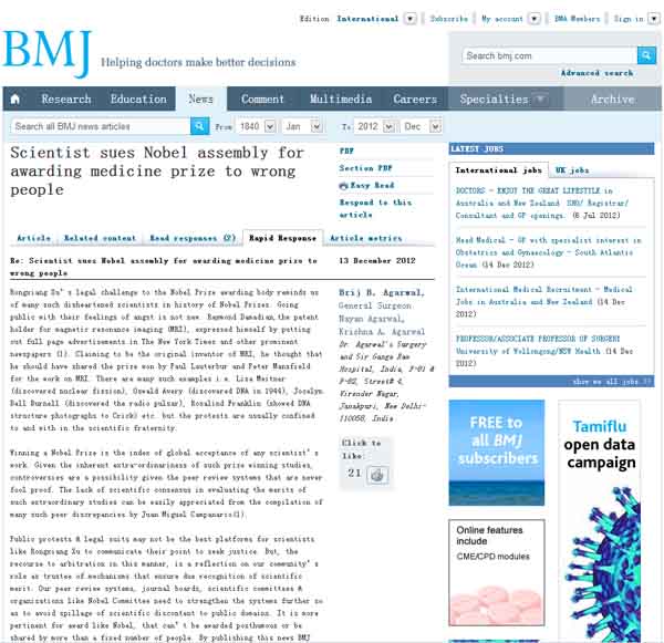 對(duì)于像徐榮祥這樣的科學(xué)家來(lái)說(shuō),公眾抗議和法律訴訟可能不是發(fā)表觀點(diǎn)、尋求正義的最好平臺(tái)。但是,這種求助于法律仲裁的手段卻反映了我們作為那些確??茖W(xué)成就獲得應(yīng)有認(rèn)可的各機(jī)構(gòu)的委托方在發(fā)揮作用時(shí)是存有問(wèn)題的。我們的同行審查系統(tǒng)、雜志董事會(huì)、科學(xué)委員會(huì)以及像諾貝爾委員會(huì)這樣的組織都需要進(jìn)一步加強(qiáng)體制以避免科學(xué)領(lǐng)域內(nèi)的紛爭(zhēng)流溢到社會(huì)公共領(lǐng)域;特別是對(duì)諾貝爾獎(jiǎng)這樣的獎(jiǎng)項(xiàng)而言,這樣的獎(jiǎng)項(xiàng)不能授予給已去世的人、也不能被超過(guò)一定數(shù)量的人所共享。英國(guó)醫(yī)學(xué)雜志(BMJ)能發(fā)布這一訴訟消息就已然說(shuō)明科學(xué)雜志也應(yīng)履行起“看門人”的職責(zé)而不只是承擔(dān)“啦啦隊(duì)長(zhǎng)”的責(zé)任。