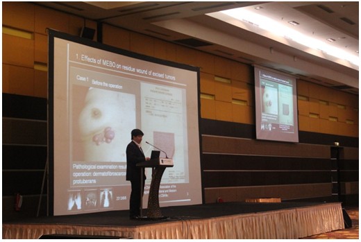第三天會(huì)議繼續(xù)進(jìn)行,來自中國(guó)中西醫(yī)結(jié)合學(xué)會(huì)燒傷專業(yè)委員會(huì)國(guó)際部主任舒葉被安排在全體會(huì)議中第一個(gè)發(fā)言。他演講的題目是再生醫(yī)療技術(shù)在癌癥創(chuàng)面的應(yīng)用,這一世界性難題用美寶再生科學(xué)的解決吸引了所有與會(huì)代表的眼球。舒葉主任先從再生醫(yī)療技術(shù)成功治療典型病例入手,深入分析三例皮膚癌患者在手術(shù)切除、放療等治療后,殘余創(chuàng)面應(yīng)用再生醫(yī)療技術(shù)成功抑制創(chuàng)面殘余癌細(xì)胞生長(zhǎng)的病例。然后,重點(diǎn)展示對(duì)癌癥細(xì)胞在再生物質(zhì)環(huán)境下分別培養(yǎng)和共培養(yǎng)結(jié)果的基礎(chǔ)研究。單獨(dú)培養(yǎng)的結(jié)果表明再生物質(zhì)環(huán)境下,癌細(xì)胞會(huì)快速死亡;非再生物質(zhì)環(huán)境下,癌細(xì)胞會(huì)迅速增殖分化,正常細(xì)胞會(huì)迅速被癌細(xì)胞吞噬。癌細(xì)胞和正常細(xì)胞的共培養(yǎng)結(jié)果顯示,在再生物質(zhì)環(huán)境下,正常細(xì)胞會(huì)逐漸增殖、分化形成新的組織;而在對(duì)照組中,癌細(xì)胞會(huì)迅速擴(kuò)張,正常細(xì)胞消失?;A(chǔ)研究的結(jié)果表明再生物質(zhì)具有抑制并殺死癌細(xì)胞,同時(shí)促進(jìn)正常細(xì)胞生長(zhǎng)的雙重功效。結(jié)合臨床真實(shí)的病例展示,再生醫(yī)療技術(shù)在癌癥方面的功效及研究吸引了全體與會(huì)人員的關(guān)注。會(huì)后,多名醫(yī)生詢問具體情況,并索要相關(guān)論文,要在當(dāng)?shù)亻_展使用。