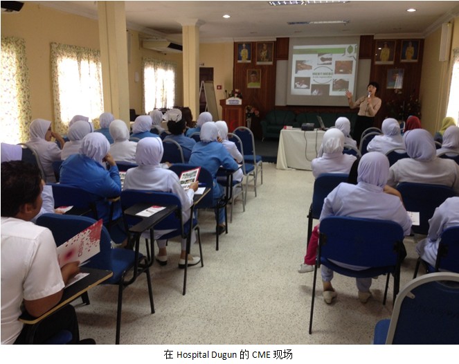10月22日, 凌晨4點(diǎn)起床,7點(diǎn)鐘飛機(jī)飛往馬來西亞東海岸的登嘉樓省,第一場CME是在 KK Kuala Berang, 出席的8位醫(yī)生,11位護(hù)士,3位藥劑師等。本次CME受到了本院瘡瘍治療診所Dr. Fauzani的大力支持。Dr. Fauzani曾在6月份來華學(xué)習(xí),回來后對再生療法的使用十分順利,她90%的病人都在使用美寶,每天都有新病人,每天都有病人詢問MEBO。Dr. Fauzani熱情安排教室,組織并通知其他義務(wù)人員前來參加。 醫(yī)生護(hù)士們提問很踴躍,多側(cè)重適應(yīng)癥,CME現(xiàn)場氣氛活躍,張美艷為所有人員詳細(xì)解答。