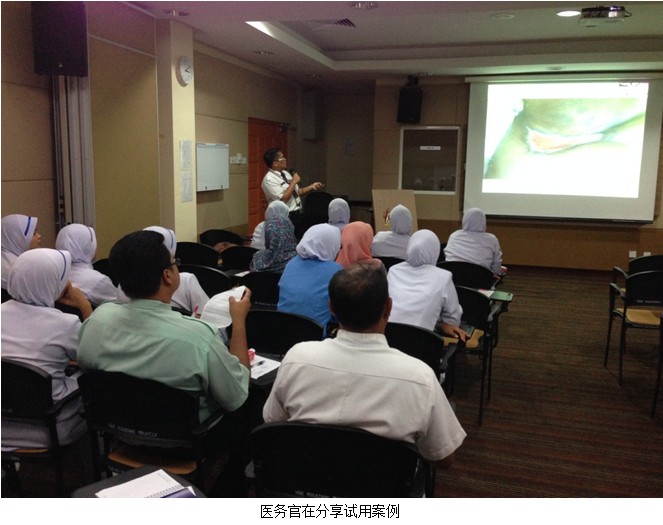 中午,美寶團(tuán)隊(duì),來到登嘉樓最南部的一個城市甘馬挽(Kemaman),該地區(qū)盛產(chǎn)石油天然氣,是南部經(jīng)濟(jì)較為發(fā)達(dá)的地區(qū)。美寶在這家醫(yī)院的使用剛開始不久,主要用于糖尿病潰瘍,需要大量的跟蹤和培訓(xùn)工作,到場的20多位醫(yī)務(wù)人員聽講認(rèn)真,能夠準(zhǔn)確回答出標(biāo)準(zhǔn)換藥,操作原則,藥物機(jī)理等問題。培訓(xùn)效果理想, 結(jié)束后與兩位醫(yī)務(wù)官和醫(yī)生吃飯,醫(yī)生們詢問了其他的適應(yīng)癥,及相關(guān)的研究論文等,并表示有興趣來華學(xué)習(xí)。