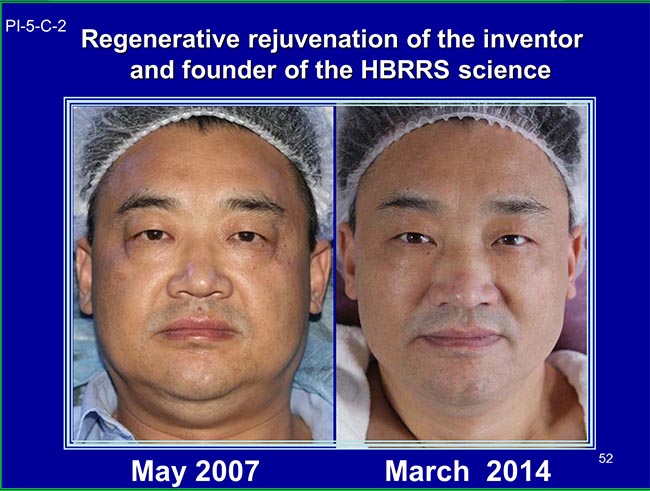 我們的人體再生復(fù)原科學(xué)應(yīng)用已經(jīng)有很多成功的結(jié)論了。皮膚是人體最大的器官,皮膚的變化代表著人體內(nèi)部的變化,大家可以看這兩張照片分別是我40多歲和將近60歲的照片(圖2),我的變化大嗎?這個變化用美容手術(shù)是不能實現(xiàn)的,我們的再生技術(shù)會使人變得年輕,我們希望不只是皮膚,希望全身其它臟器官都可以變年輕。一位志愿者在2007年與2014年的照片也就是50多歲與61歲時的對比照片,觀察其外貌,已經(jīng)返老還童,現(xiàn)在比2007年前更年輕。女士想保持年輕,想變漂亮,男士也一樣。還有一位志愿者,是我們國家的前領(lǐng)導(dǎo)人,2005年88歲,2013年96歲,通過這樣的對比其容貌返老還童,96歲的老人看起來依然是身體健壯,精神矍鑠,比88歲時年輕了很多。首長告訴我們:“不管怎么樣,服用再生物質(zhì)沒有壞處,我現(xiàn)在身體很好,腦子變聰明了,已經(jīng)6年多沒有去醫(yī)院看過醫(yī)生了。”