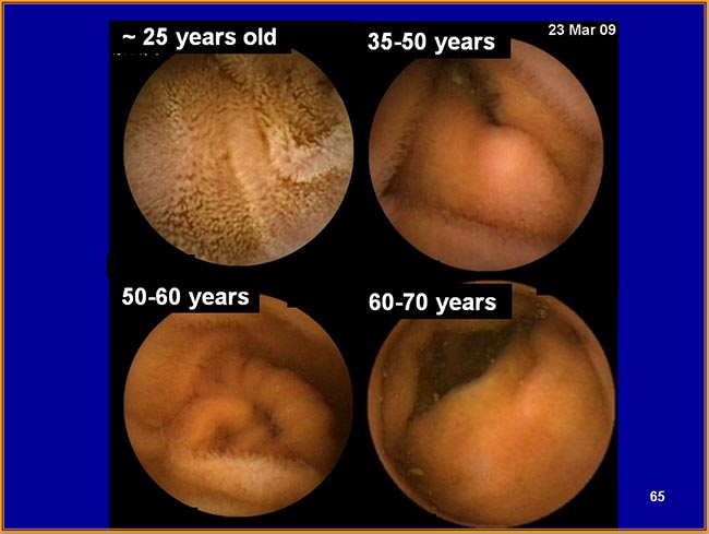下面再來介紹我們的實驗結(jié)果,中年大白鼠喂養(yǎng)試驗,這個實驗大家都可以重復(fù)做。我們用再生的方法,給大白鼠喂養(yǎng)再生物質(zhì),喂養(yǎng)到兩倍的年齡時,沒有喂養(yǎng)再生物質(zhì)的大白鼠都死了,而喂養(yǎng)再生物質(zhì)的大白鼠不但沒有死,而且還活得更年輕,這些大白鼠所有的器官都是再生更新過的,有一些老的器官經(jīng)過再生更新后,通過新的染色的方法都可以明顯表現(xiàn)出來。這個試驗結(jié)果是向人們昭示,再生營養(yǎng)物質(zhì)除了能夠使細(xì)胞再生更新,還滿足了人類追求“長生不老”的向往,人可以活到200歲到300歲。但這需要很多的技術(shù)配合才能實現(xiàn)。接下來我再介紹人體內(nèi)部器官的再生復(fù)原和完成,我們可以看到衰老的胃腸組織、腸壁、腸腺、腸絨毛,但這些都是年輕的腸絨毛。在另外一副圖中可以看到每個年齡段胃腸道的變化情況。從20歲到70歲胃腸道的變化。20歲之前是這樣,50歲之前是這樣,60歲以前是這個狀態(tài),70歲以前的是這個狀態(tài)。(圖3)我們是要把70歲胃腸道狀態(tài)變成20歲胃腸道的樣子,衰老變成年輕的,這些我們都已經(jīng)成功做到了。這就是科學(xué)運用的結(jié)果。美國的再生科學(xué)領(lǐng)袖講道:“我們在體外建立一個模型都很難,而你們還能讓器官原位長出來。”下一步我們會在國際上找300個病例來進行公開再生還童,一年之內(nèi)讓衰老的胃腸變年輕。我想,當(dāng)我們完成這項工作后,世界人民會歡呼,人類可以享受這一全新的科學(xué)啦。