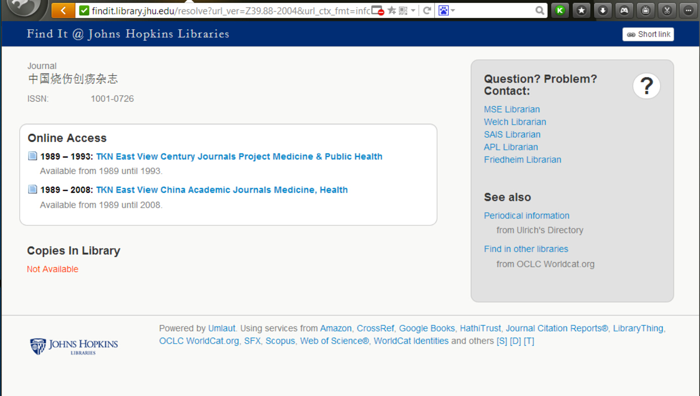 約翰•霍普金斯大學(Johns Hopkins University)收錄中國燒傷創(chuàng)瘍雜志