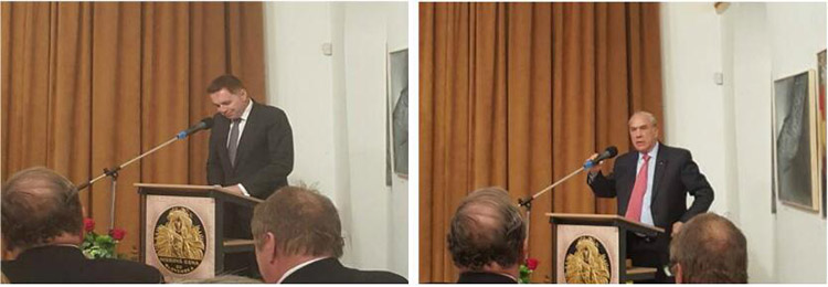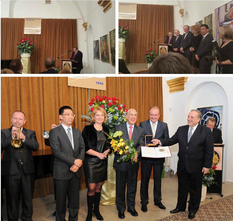 美寶國際市場總經理劉鋼與區(qū)域經理張印與歐洲非正式經濟論壇主席Peter Kasalovsky及斯洛伐克第二任總統(tǒng)魯?shù)婪?middot;舒斯特(Rudolf Schuster)進行了友好交流。作為在整個歐洲乃至世界多個國家和區(qū)域的政治、經濟、社會、人文等領域始終保持著活躍角色及深遠影響力的歐洲非正式經濟論壇主席Peter Kasalovsky表達了對徐榮祥教授的深切懷念,他說:“徐榮祥教授是我的兄弟、好朋友,他雖然不能再參加我們的活動,但是在我們心里一直懷念著他。此次頒獎大會特意為他留了一個空位,座位上放著他照片及紀念郵票,代表著徐教授也參加了這次盛會。”