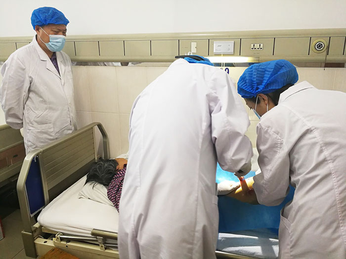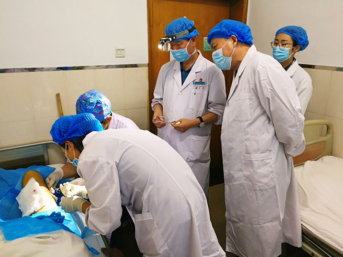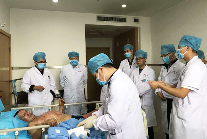 楊智斌總裁此行還會(huì)見(jiàn)了西安交通大學(xué)附屬西安第九醫(yī)院燒傷科肖厚安主任,該院作為陜西中西醫(yī)結(jié)合學(xué)會(huì)燒傷專業(yè)委員會(huì)主委單位,在再生醫(yī)療技術(shù)的臨床應(yīng)用中取得了一定成果,特別是在再生療法配合自體微粒皮種植技術(shù)治療面積較大的皮瓣、組織缺損創(chuàng)面的應(yīng)用方面,解決了傳統(tǒng)燒傷、創(chuàng)面治療缺少皮源這一難題。在肖厚安主任的陪同下,楊智斌總裁還現(xiàn)場(chǎng)觀摩了微粒皮種植術(shù)臨床應(yīng)用,認(rèn)真聽(tīng)取了該科室多年來(lái)應(yīng)用再生醫(yī)療技術(shù)治療的病例總結(jié)。