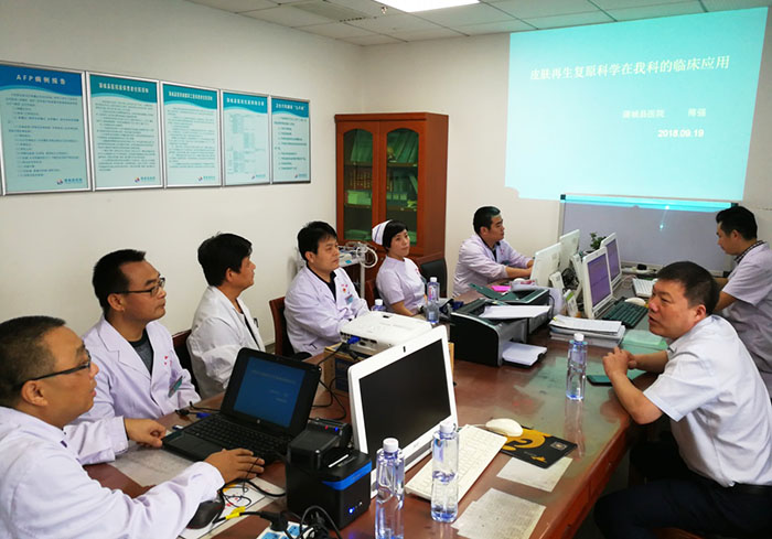 2018年9月19日上午,楊智斌總裁又在陜西中西醫(yī)結(jié)合學(xué)會(huì)燒傷專業(yè)委員會(huì)劉華秘書(shū)的陪同下,對(duì)蒲城縣醫(yī)院進(jìn)行參觀訪問(wèn)。對(duì)燒傷科當(dāng)前住院及門(mén)診治療的燒傷創(chuàng)瘍病人治療情況進(jìn)行了實(shí)地考察,并就雙方進(jìn)一步合作與院領(lǐng)導(dǎo)進(jìn)行了座談。蒲城縣醫(yī)院以付強(qiáng)主任為核心全程規(guī)范應(yīng)用再生醫(yī)療技術(shù)二十多年,治療過(guò)的病人效果好、費(fèi)用低,在渭南地區(qū)形成一定影響力。