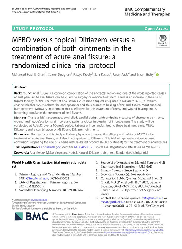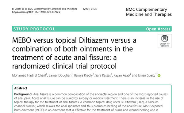 日前,一項由貝魯特美國大學(xué)醫(yī)學(xué)中心醫(yī)學(xué)博士、首席研究員Eman Sbaity發(fā)起的MEBO與Diltiazem兩種軟膏制劑在急性肛裂治療中的對比試驗研究方案在BMC Complementary and Alternative Medicine(BMC補充與替代醫(yī)學(xué))雜志發(fā)表。該研究方案已在世界衛(wèi)生組織WHO試驗注冊數(shù)據(jù)集備案,以為該研究方案提供信息存檔、訪問查詢、進展追蹤及研究評估等。