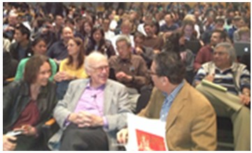 羅恩•埃文斯(右)交談。第二排穿棕色衣服的是諾獎得主羅杰錢。