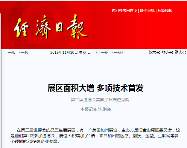 經(jīng)濟(jì)日?qǐng)?bào):展區(qū)面積大增 多項(xiàng)技術(shù)首發(fā) ——第二屆進(jìn)博會(huì)美國(guó)加州展位見聞