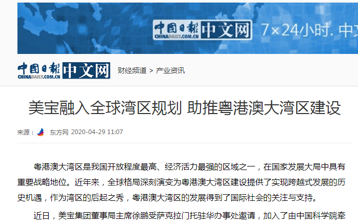 中國日報:美寶融入全球?yàn)硡^(qū)規(guī)劃 助推粵港澳大灣區(qū)建設(shè)