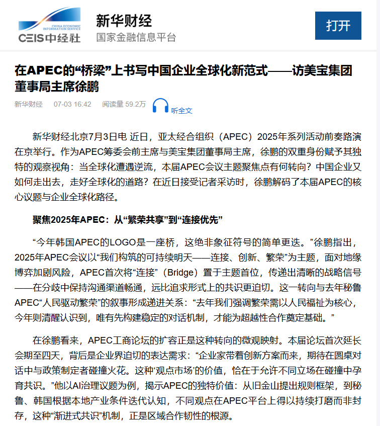 新華財經(jīng):在APEC“橋梁”上書寫中國企業(yè)全球化新范式—訪美寶集團(tuán)董事局主席徐鵬