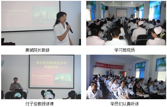 學(xué)術(shù)會議由醫(yī)院醫(yī)教科長劉杰主持,參會人員近70人,均為醫(yī)院的一線醫(yī)護(hù)工作人員。會議首先由姜斌院長致辭,付主任在大家熱烈的掌聲中開始了講座,付主任圖文并茂、深入淺出的講座讓在座的每一位學(xué)員都聽得津津有味,他將再生醫(yī)療技術(shù)的實用性,經(jīng)濟行,可操作性做了詳細(xì)的介紹,并且重點介紹了規(guī)范的再生醫(yī)療技術(shù)的換藥方法和原則。姜院長全程聽完了付主任的講座并作會議總結(jié),她表示,再生醫(yī)療技術(shù)是一項非常實用的技術(shù),是真正適合基層醫(yī)院應(yīng)用的技術(shù)。學(xué)術(shù)會后大家都不愿離開,爭先恐后的提問讓付主任應(yīng)接不暇,付主任坐到大家中間,耐心的一一詳細(xì)解答大家的提問。