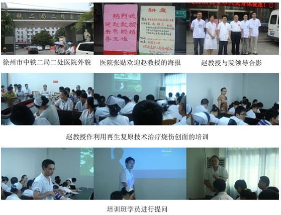 2012年7月下旬應(yīng)蘇北南京消防燒傷醫(yī)院、徐州老年病醫(yī)院、邳州中鐵二局二處醫(yī)院的邀請,北京燒傷創(chuàng)瘍研究所趙瑞慶教授在蘇北再生復(fù)原技術(shù)推廣辦事處主任劉恒以及周銀梅的陪同下,分別在蘇北地區(qū)舉辦院級(jí)培訓(xùn)班兩期,科內(nèi)培訓(xùn)班一期,受到了當(dāng)?shù)蒯t(yī)務(wù)人員的一致好評(píng)。