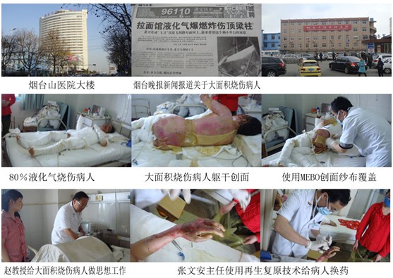 煙臺(tái)山醫(yī)院燒傷整形科曾在2011年10月份在張文安主任的帶領(lǐng)下使用再生復(fù)原技術(shù)治療一例85%大面積燒傷病人獲得成功。此例80%液化氣燒傷病人剛送到醫(yī)院,血壓下降,張文安主任沉著應(yīng)戰(zhàn)雙通道液體輸入抗休克搶救,并早期進(jìn)行簡(jiǎn)易清創(chuàng)后創(chuàng)面用MEBO覆蓋(因病人信仰伊斯蘭教)。在第一時(shí)間北京燒傷創(chuàng)瘍研究所趙瑞慶教授也趕到搶救現(xiàn)場(chǎng)指導(dǎo)進(jìn)一步治療。