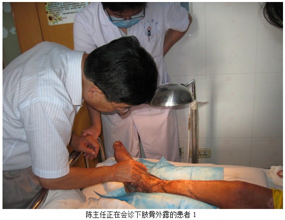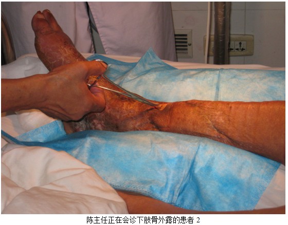 2012年8月5日中國中西醫(yī)結(jié)合學(xué)會燒傷專業(yè)委員會委員、北京美寶燒傷創(chuàng)瘍研究所臨床部專家陳全喜應(yīng)河南省新鄉(xiāng)醫(yī)學(xué)院第三附屬醫(yī)院骨科李主任和孫大夫的邀請,會診一例下肢骨露的患者。