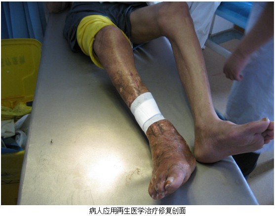 骨科李教授和孫副教授及陳全喜主任一同會(huì)診病人?;颊?7歲,2011年12月4號(hào),因車(chē)禍造成右下肢脛腓骨粉碎性骨折。從臨床看,脛骨外露長(zhǎng)12cm,寬6.3cm缺損。骨表面色黃,骨邊緣暗黃色,骨髓缺損(脛骨下端直踝關(guān)節(jié),未發(fā)現(xiàn)有骨髓)。骨缺損處呈不規(guī)則形,固定鋼板,固定針暴露,周?chē)つw暗黑,邊緣齊純。李教授說(shuō):“我們已經(jīng)做過(guò)六次手術(shù),其他部位都長(zhǎng)好了,就是這個(gè)部位長(zhǎng)不住?!标愔魅握f(shuō):“臨床最多見(jiàn)的是粉碎性骨折,尤其是脛前骨難以愈合。因?yàn)榧∪馍傺\(yùn)差,再加上有其他原因,這個(gè)部位是骨科醫(yī)生棘手的技術(shù)問(wèn)題。這種創(chuàng)面需用一種培養(yǎng)細(xì)胞的物質(zhì)對(duì)對(duì)其進(jìn)行治療,能起到一定的療效。美寶皮膚再生技術(shù)是國(guó)際上較前沿的技術(shù),是培養(yǎng)創(chuàng)面局部缺損的細(xì)胞,激活潛藏骨髓、骨皮膚的潛能細(xì)胞。由潛能細(xì)胞轉(zhuǎn)化成體細(xì)胞,由體細(xì)胞轉(zhuǎn)化為干細(xì)胞,修復(fù)骨髓,骨缺損,皮膚組織,最終完成創(chuàng)面修復(fù)任務(wù)?!?/FONT>
