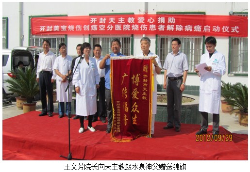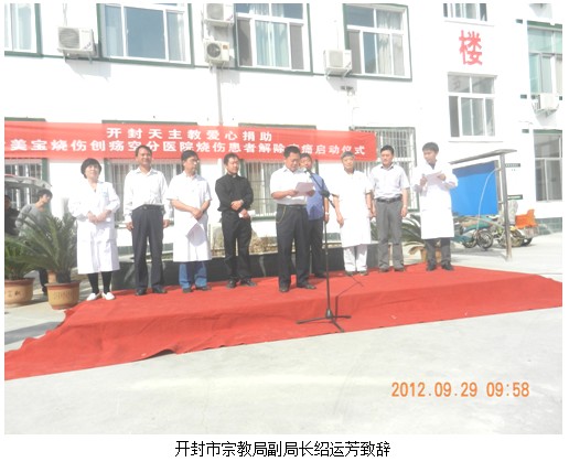 活動(dòng)啟動(dòng)儀式在醫(yī)院的精心組織下準(zhǔn)時(shí)舉行。開封市宗教局紹運(yùn)芳副局長(zhǎng),開封市天主教柴玉良、趙水泉神父,天主教仁愛置業(yè)公司經(jīng)理連汴生先生,中國(guó)燒傷創(chuàng)瘍科技中心醫(yī)療部主任金黨軍先生,河南省中西醫(yī)結(jié)合學(xué)會(huì)燒傷專業(yè)委員會(huì)秘書長(zhǎng)陳全喜先生,開封美寶燒傷創(chuàng)瘍空分醫(yī)院院長(zhǎng)王文芳、副院長(zhǎng)李明等參加了啟動(dòng)儀式。