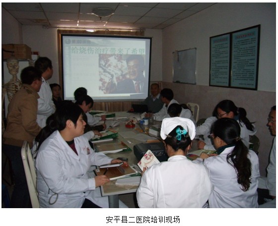 2012年11月13日及23日,應(yīng)安平縣二醫(yī)院和東光縣人民醫(yī)院的邀請,中國中西醫(yī)結(jié)合學(xué)會燒傷專業(yè)委員會常委樊兆宗教授在兩家醫(yī)院分別院進(jìn)行了“再生復(fù)原醫(yī)療技術(shù)在創(chuàng)面修復(fù)中的應(yīng)用”學(xué)術(shù)培訓(xùn)。樊教授在授課中展示了大量的臨床病例圖片,介紹了不同深度的燒傷創(chuàng)面及各類難愈性創(chuàng)傷、潰瘍創(chuàng)面的規(guī)范化處理方法與技巧、注意事項(xiàng)等;強(qiáng)調(diào)了再生復(fù)原療法在深I(lǐng)I度和III度燒傷創(chuàng)面清創(chuàng)時(shí)要盡早進(jìn)行處理,加速創(chuàng)面的液化;演示了糖尿病足等難愈性創(chuàng)面中筋膜室減壓和壞死組織徹底的清創(chuàng)術(shù);介紹了多功能敷料創(chuàng)瘍貼的應(yīng)用范圍、適應(yīng)癥、規(guī)范清創(chuàng)換藥技術(shù)等。參加培訓(xùn)的醫(yī)務(wù)人員均被這一技術(shù)神奇的療效所折服。