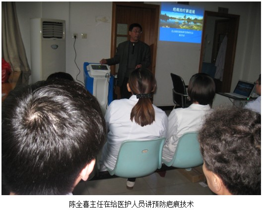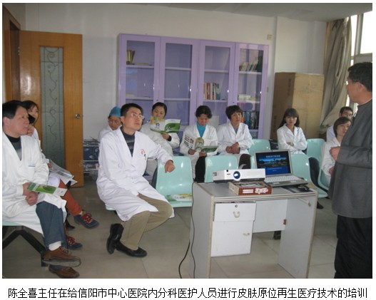 2012年11月18日,中國中西醫(yī)結(jié)合學(xué)會燒傷專業(yè)委員會委員、北京美寶燒傷創(chuàng)瘍研究所臨床部專家陳全喜主任受信陽市中心醫(yī)院內(nèi)分泌科主任郭向陽的邀請和區(qū)域經(jīng)理李瑩瑩一同到信陽市中心醫(yī)院內(nèi)分泌科進(jìn)行全科人員的皮膚原位再生醫(yī)療技術(shù)的培訓(xùn)。