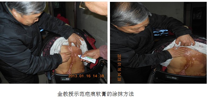 此次來到宜昌,金教授還走訪了一位背部大面積燙傷的老年患者,使用美寶疤痕軟膏快兩個月,患者中風(fēng)不能行走,之前市場技術(shù)支持人員曾發(fā)過圖片并進行過電話指導(dǎo),此次金教授向家屬詳細了解了情況,并親自示范如何涂抹藥膏,如何使藥膏發(fā)揮更大作用。