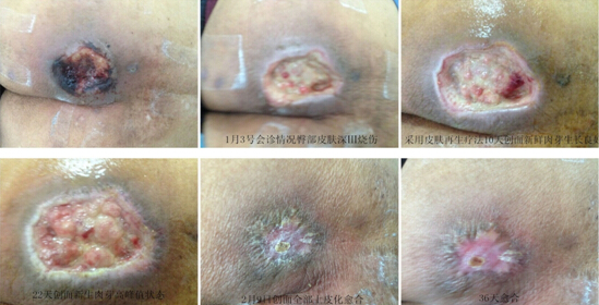 2014年深秋一名來自太原北部郊區(qū)的農(nóng)民患者,身患嚴(yán)重的腰椎間盤突出癥狀,給生活勞動帶來諸多不便。經(jīng)醫(yī)院診斷,確診后腰椎管狹窄,腰椎第4、5間盤突出,經(jīng)醫(yī)患溝通后同意行①椎間盤射頻熱凝術(shù)。②椎間盤開放手術(shù)加鋼板手術(shù)。術(shù)后發(fā)生左下肢去神經(jīng)皮膚癥狀(無疼痛感覺)科室采用綜合醫(yī)診,包括針灸按摩等,12月下旬,行艾灸針灸時,因艾卷脫落,將臀部皮膚深度燒傷(深Ⅲ°)。2015年元月3日,北京燒傷創(chuàng)瘍研究所副所長趙瑞慶教授應(yīng)邀前往該院進(jìn)行會診,在該院頸椎疼痛科醫(yī)務(wù)人員的積極配合下,及時清除焦痂樣深部壞死組織,局部用藥改用徐榮祥教授創(chuàng)立的燒傷創(chuàng)瘍再生醫(yī)學(xué)與療法,10天后創(chuàng)面發(fā)生了可喜的變化。壞死組織清理液化完畢,新生的肉芽開始生長。25天后肉芽生長達(dá)到高峰值狀態(tài),將創(chuàng)口完全填充豐滿。36天創(chuàng)面完全封閉。春節(jié)后趙教授隨訪病人時,患者非常激動地說到:感謝趙教授多次來院給我看病,我的傷口采用新方法治療,中間沒有發(fā)生感染,一個多月就好嘞,我太高興了!