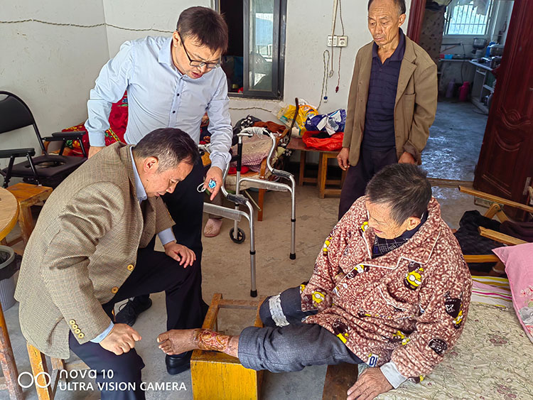 2022年11月7日,北京榮祥再生醫(yī)學(xué)研究所副所長、《中國燒傷創(chuàng)瘍雜志》編委金黨軍應(yīng)江西省贛州市南康區(qū)中醫(yī)院外一科嚴(yán)主任的邀請,和江西省辦事處主任陳立新、贛州地區(qū)負責(zé)人肖曉春一起來到南康區(qū)中醫(yī)院外一科,在科室主任和醫(yī)生的陪同下一起會診了3例慢瘡(外傷后感染久治不愈、壓瘡、頸部道久不愈合)病人,并親自用再生醫(yī)療技術(shù)為患者規(guī)范換藥,獲得主任和科室醫(yī)護人員、患者家屬的一致好評。